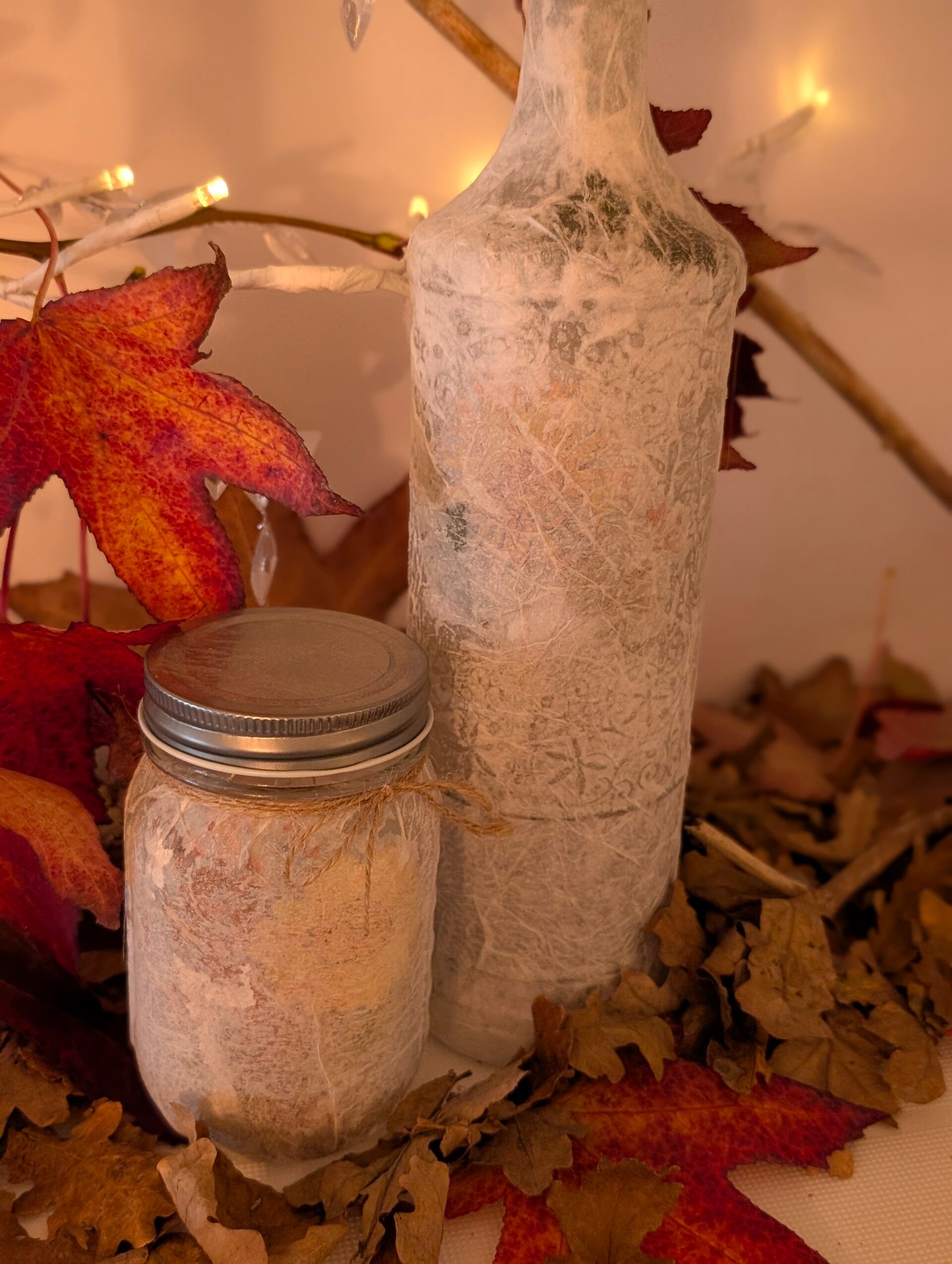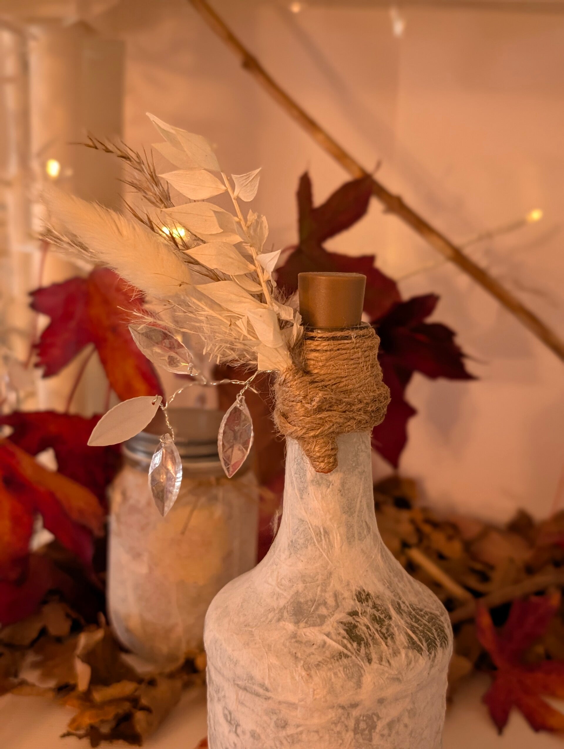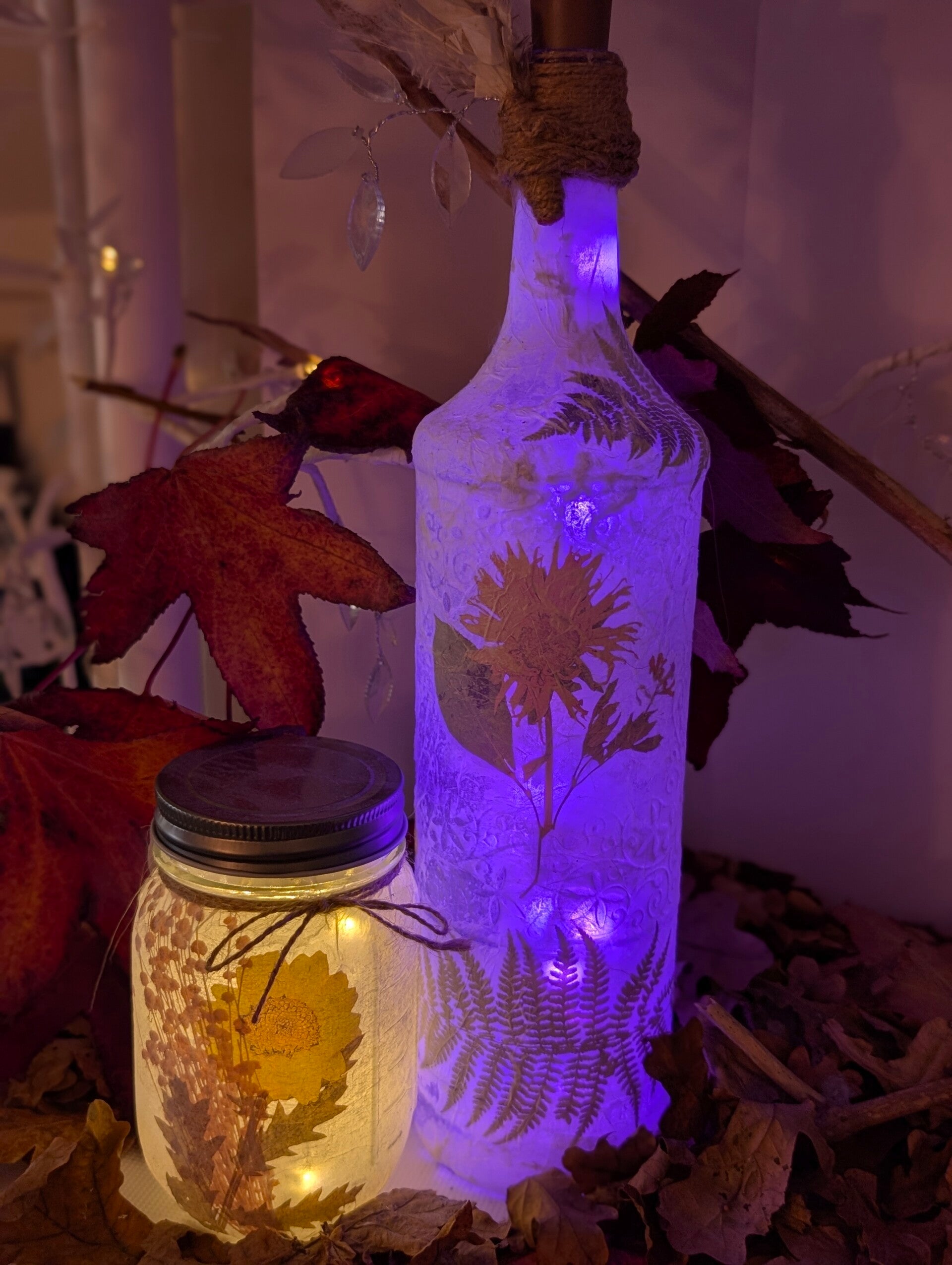 Transform your home with this enchanting pair of upcycled lights, lovingly handcrafted from a glass jar and a bottle. Perfect for adding a cozy, rustic glow to any room, these pieces offer beauty both day and night.