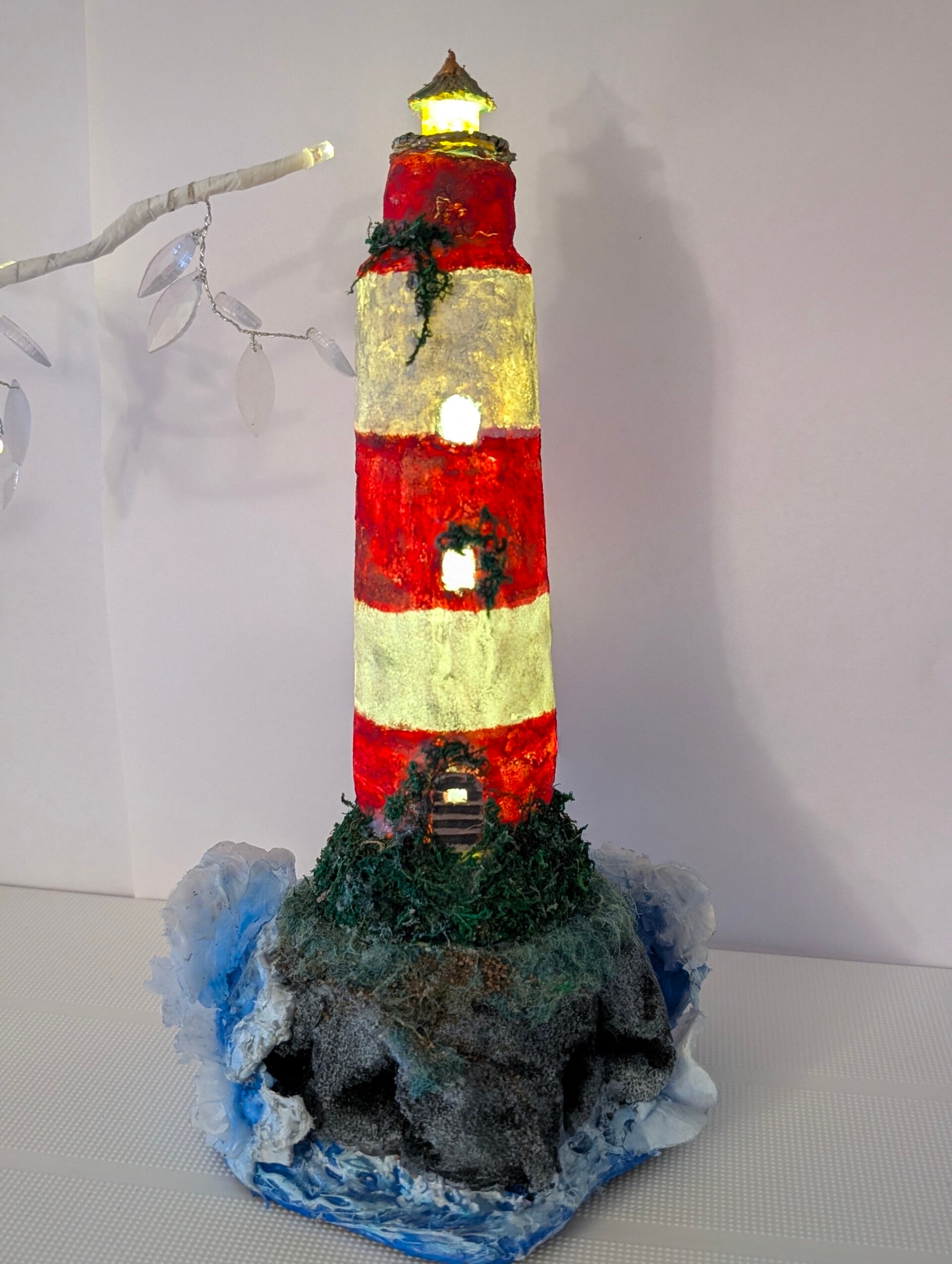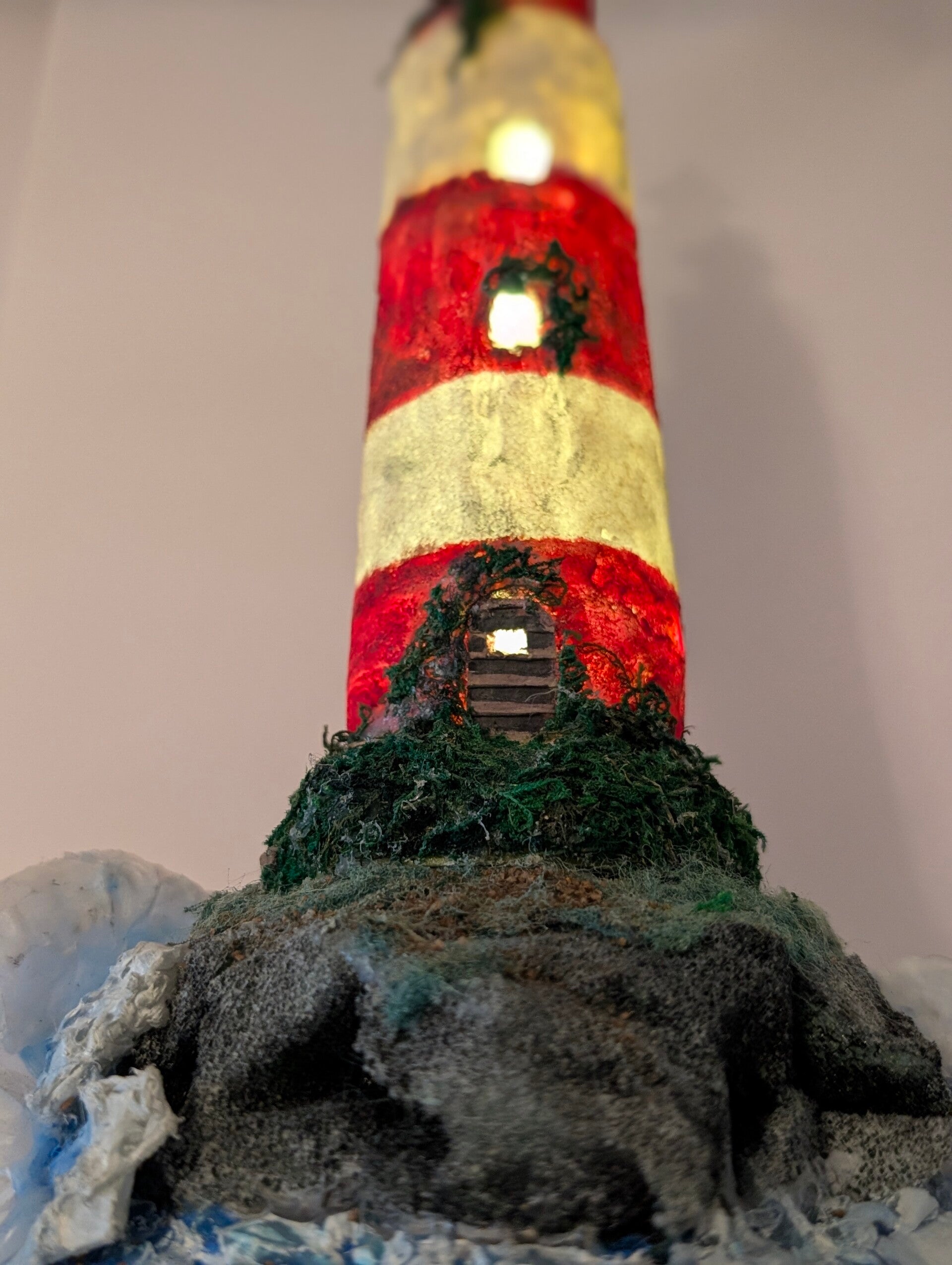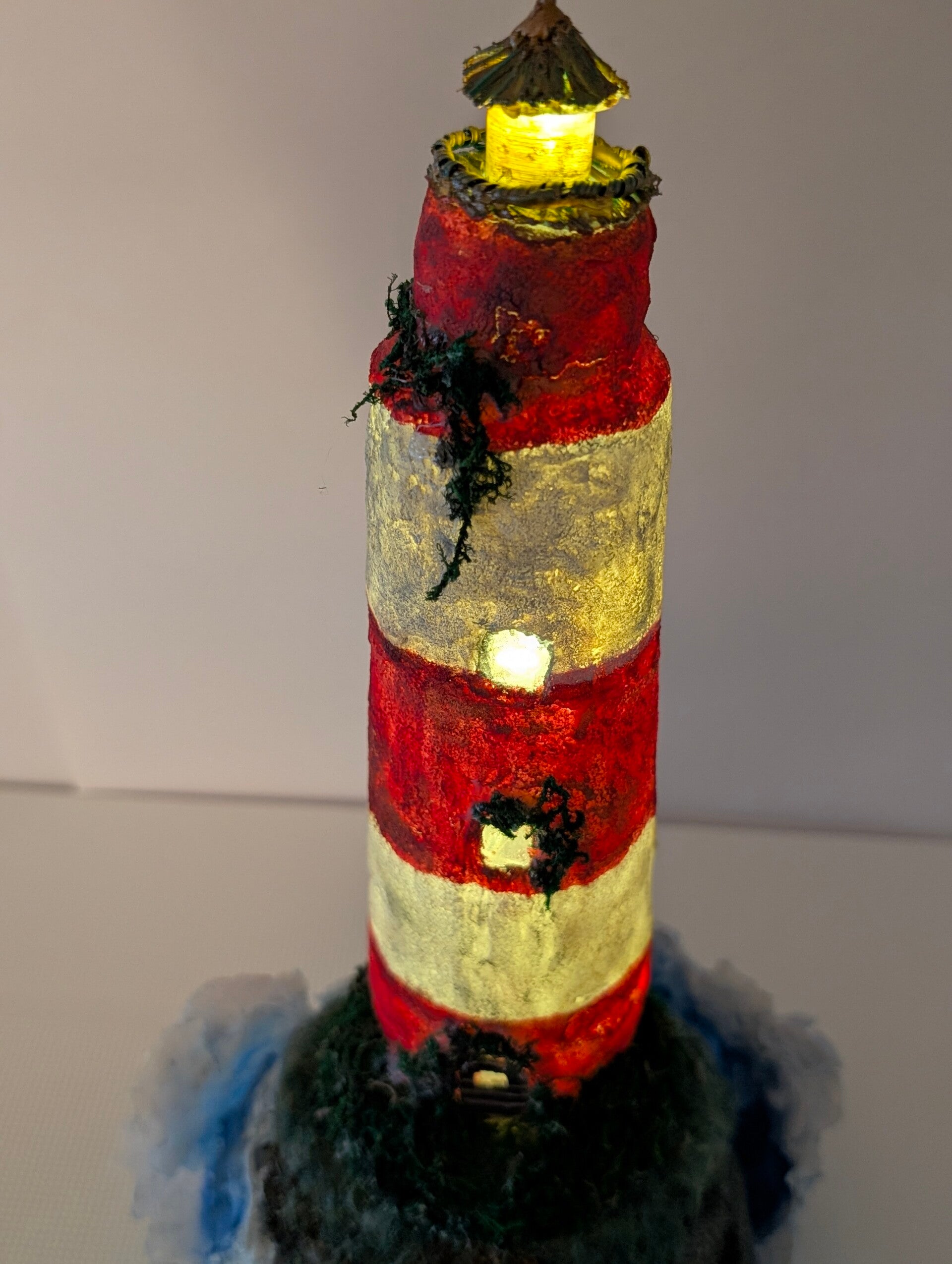 Created from a repurposed bottle, this tower features classic red and white stripes with a wonderfully aged, textured finish. Details like the tiny windows, mossy base, and realistic lantern cap bring it to life. When lit by the internal LED, the light shines warmly through the windows and the lantern room, creating a cozy, guiding glow.