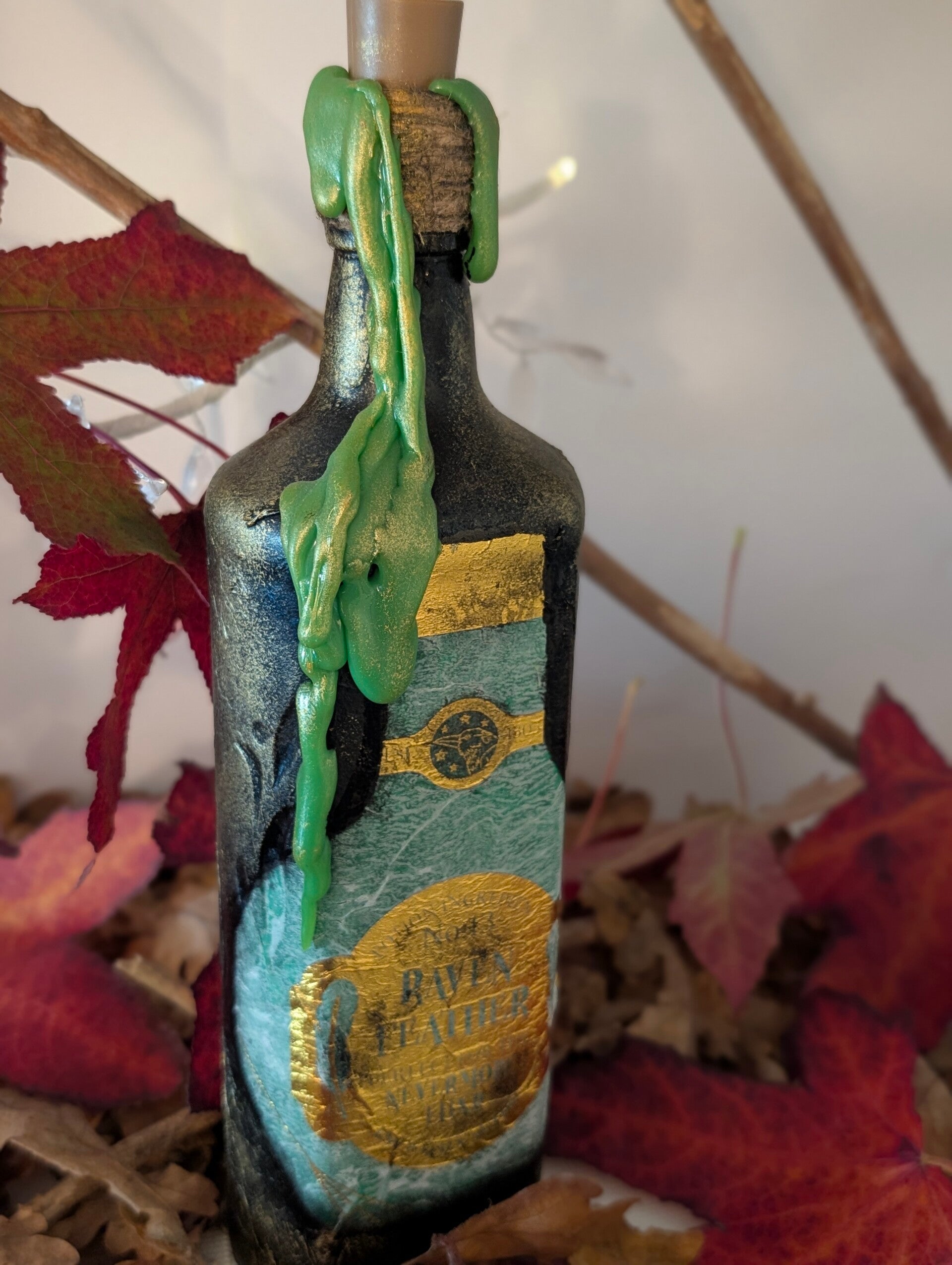 The Look: This upcycled glass bottle is dramatically painted in matte black and metallic gold, giving it a weathered, antique finish. The neck is sealed with a sinister drip of shimmering green "wax" for an authentic, aged potion feel.