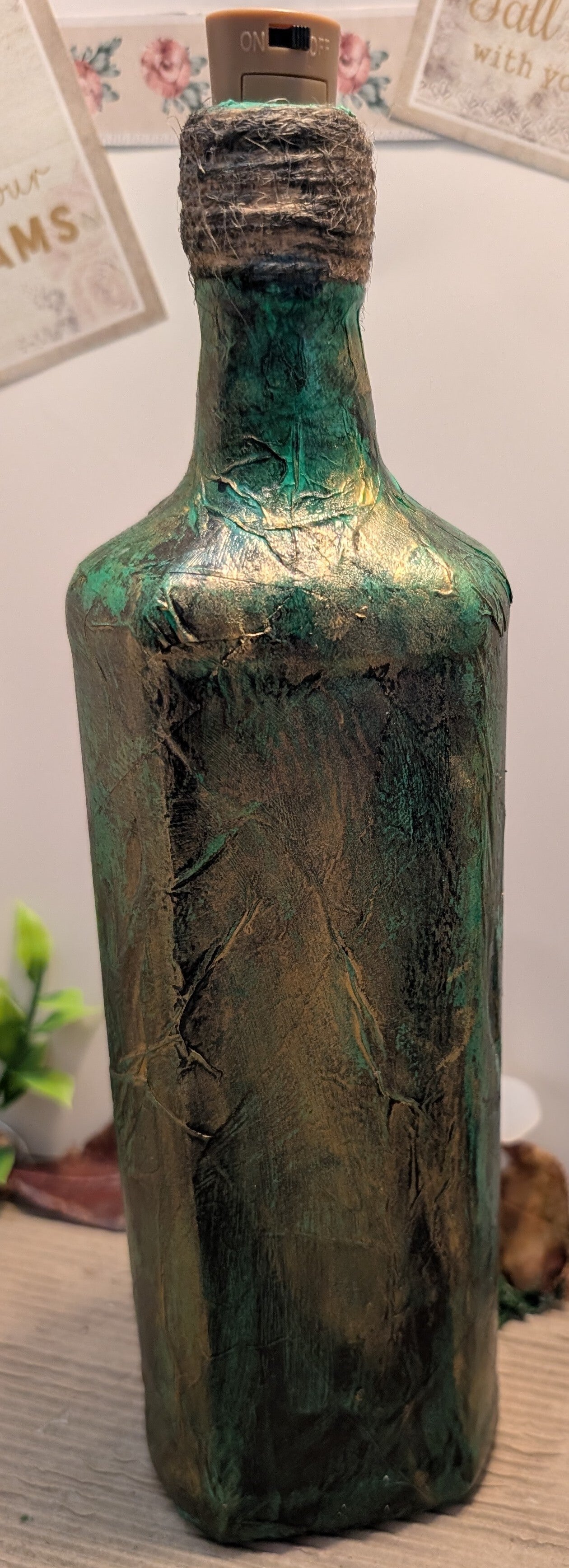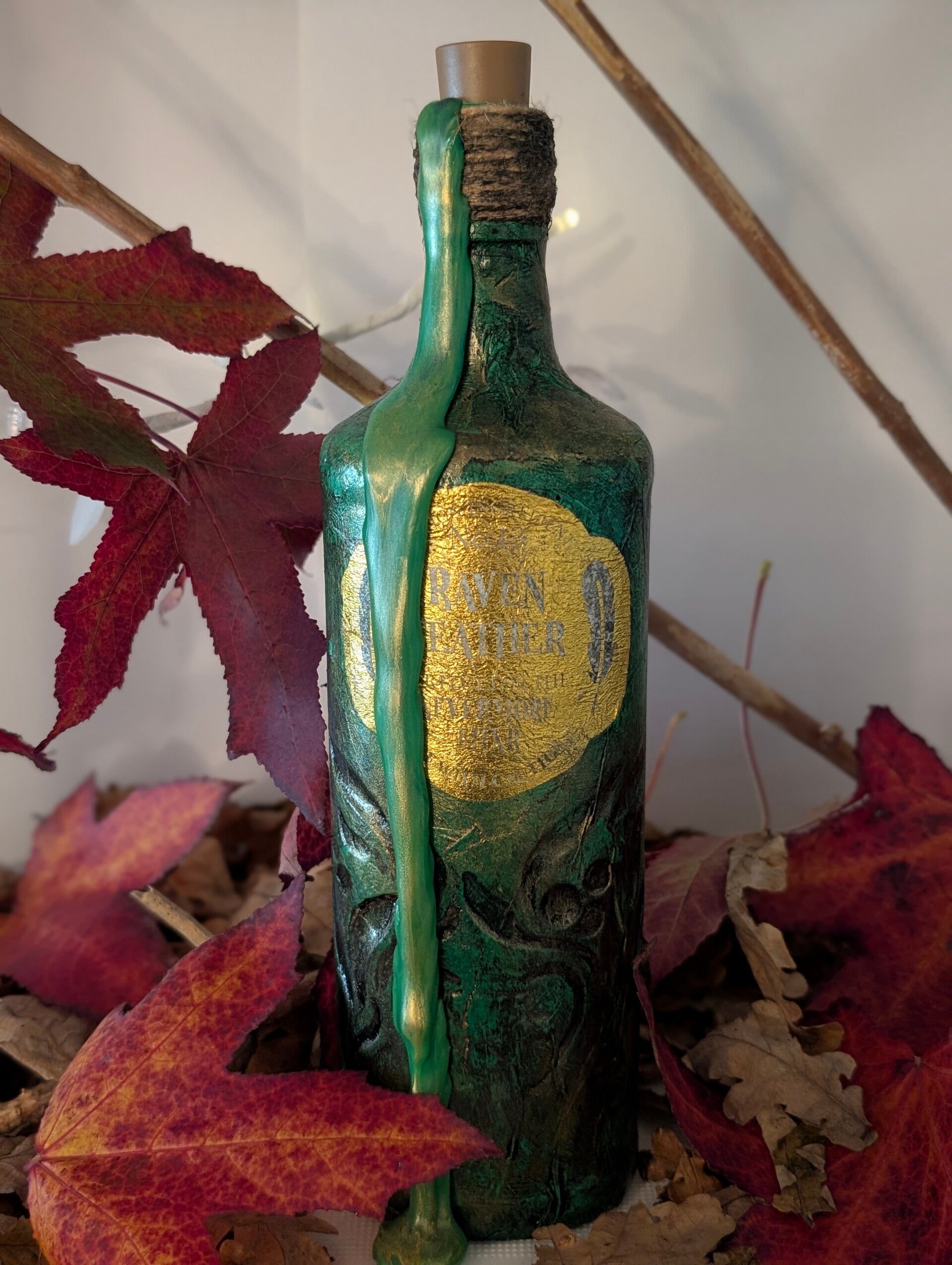 The Look: This upcycled glass bottle is richly decorated with layers of deep forest green and bronze/gold textures, evoking aged moss and ancient secrets. The intricate, sculpted details around the bottle body add a captivating tactile quality.