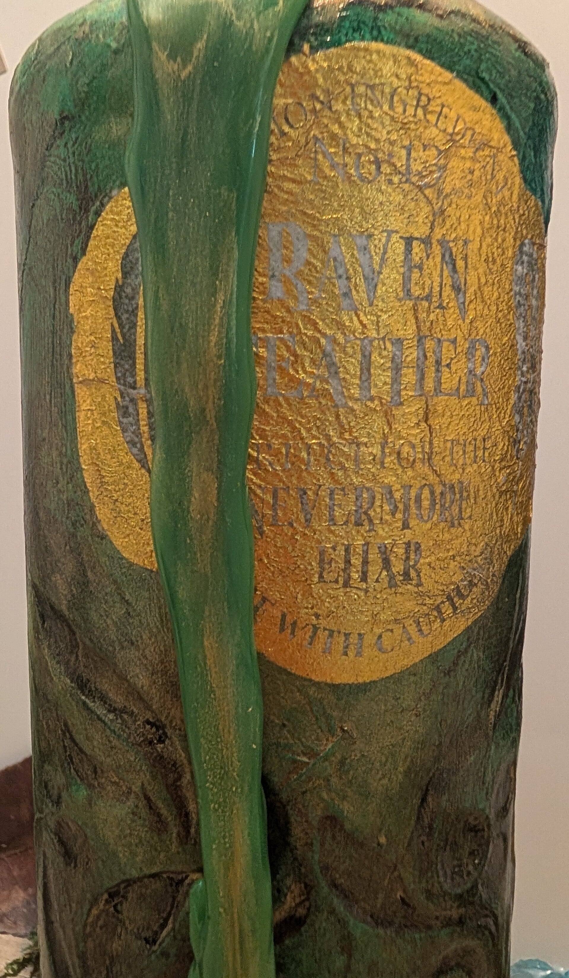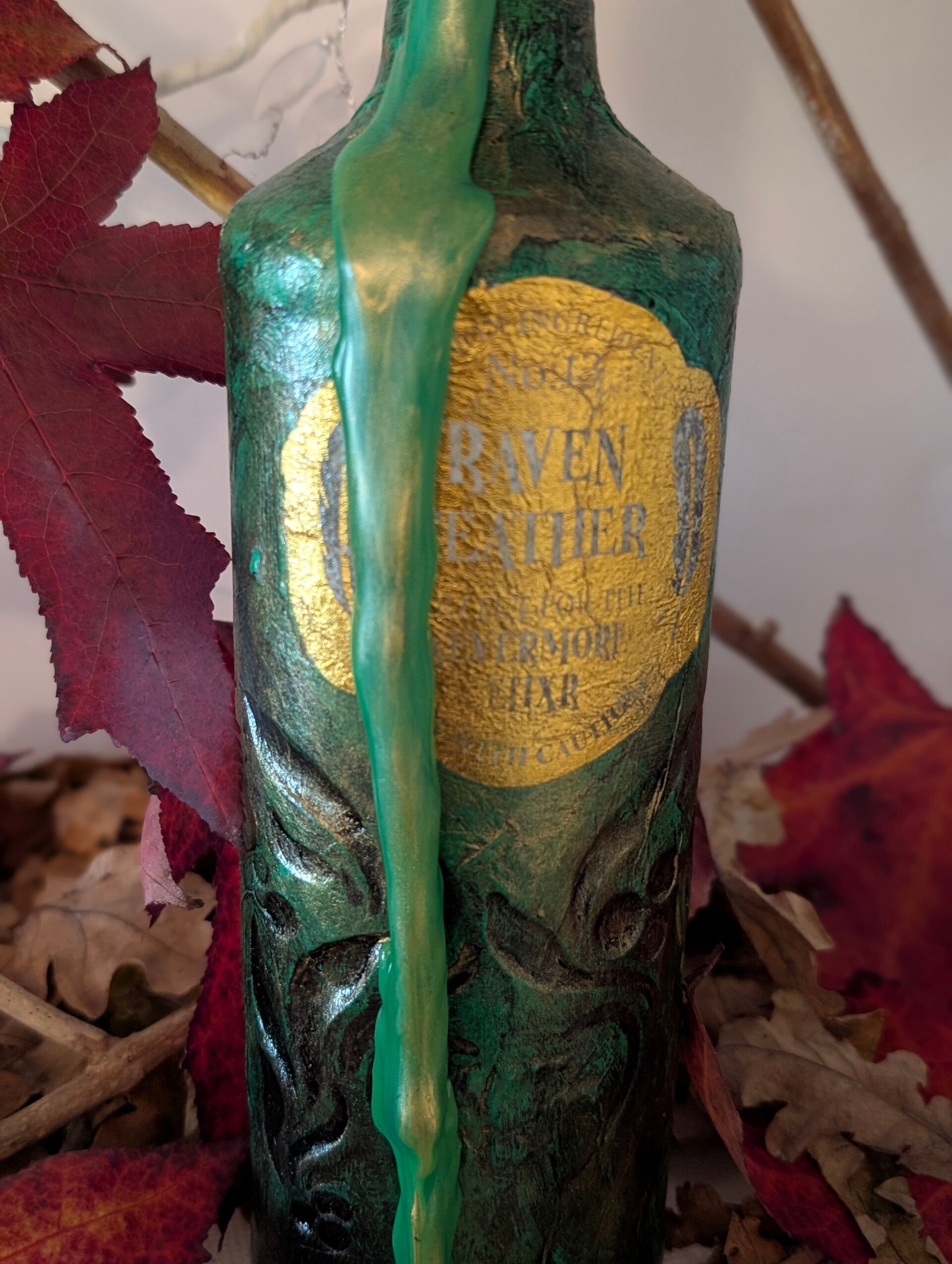 The Label: A custom-designed label, featuring the cryptic text "Raven Feather... for the Nevermore Elixir," is highlighted in metallic gold.