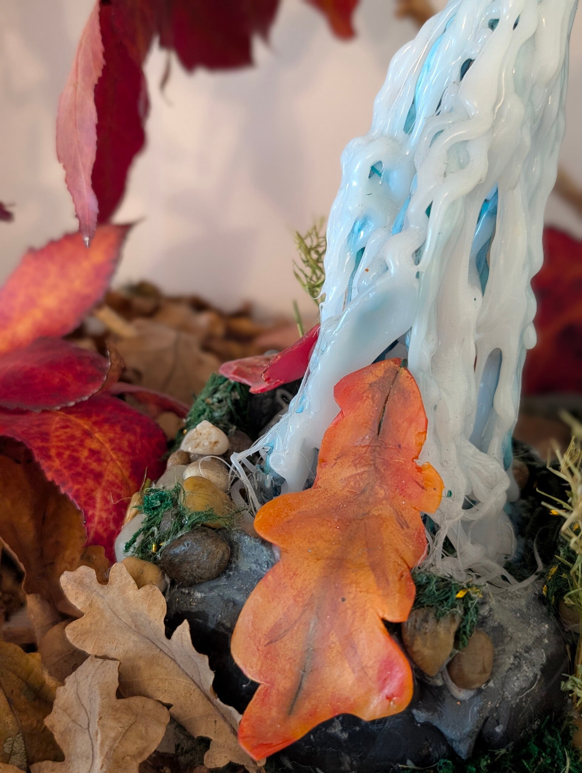 Detailed Base: The base is a miniature landscape, complete with textured rocks, vibrant green moss, tiny pebbles, and delicate foliage, enhancing the magical, natural feel of the piece.