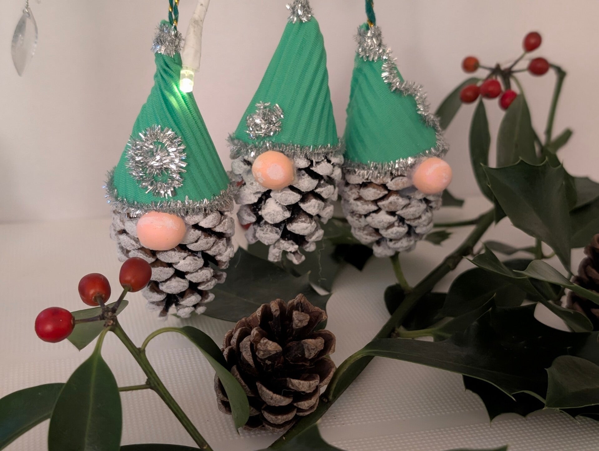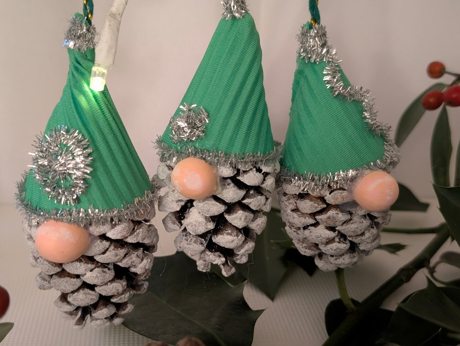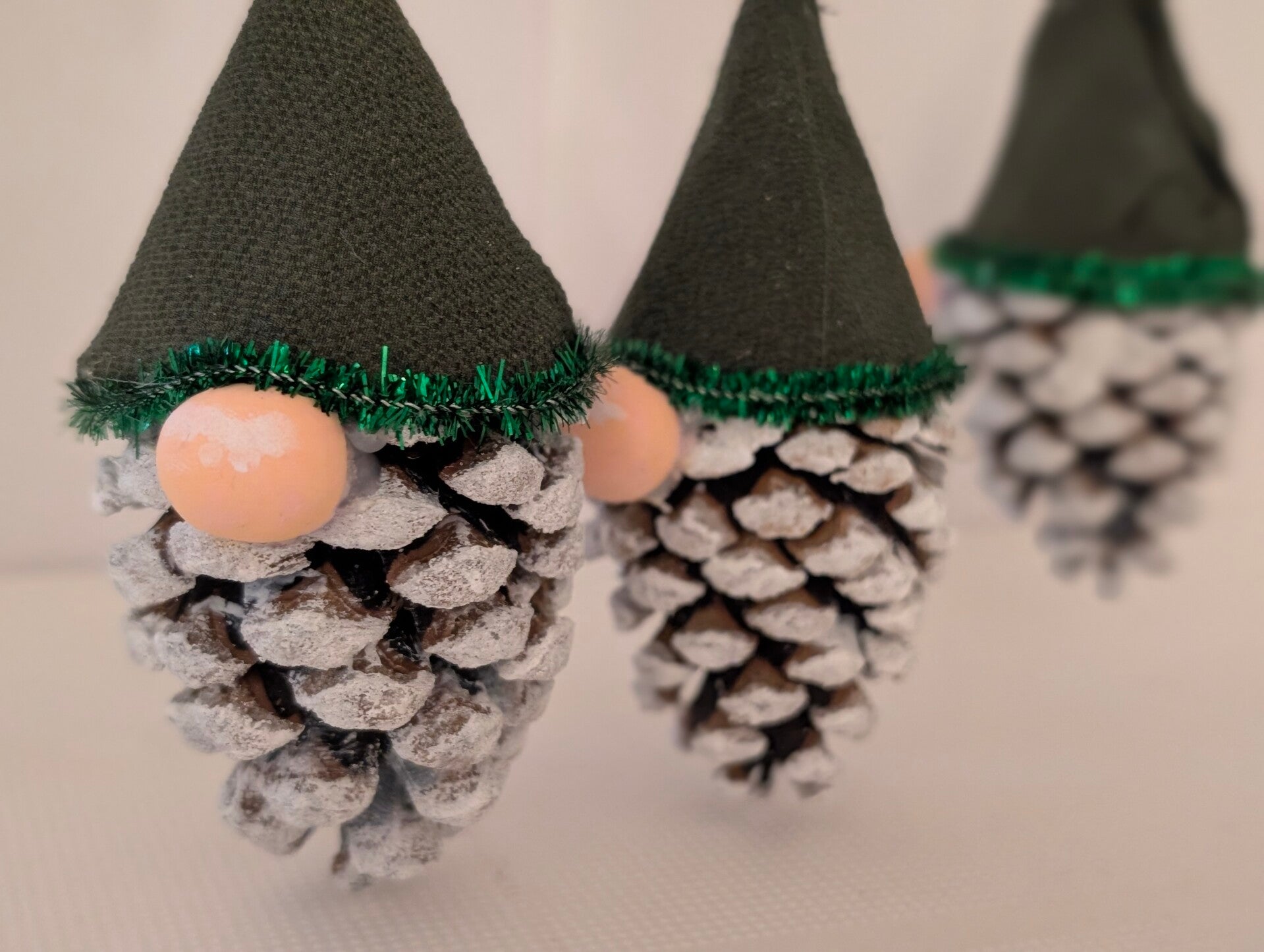 Natural Base: Each gnome is built upon a real pinecone that has been lightly frosted with white paint, resembling a dusting of fresh snow.
