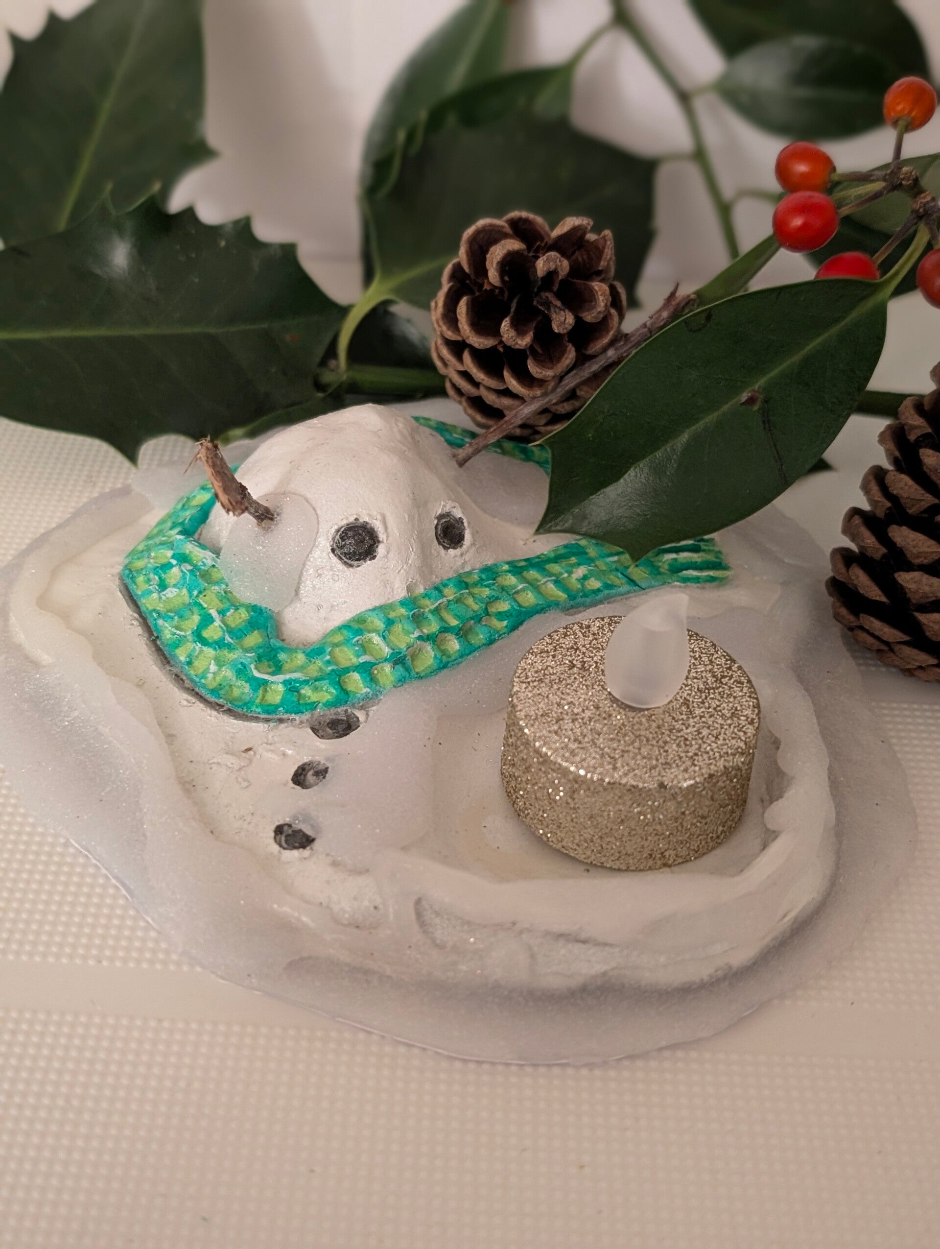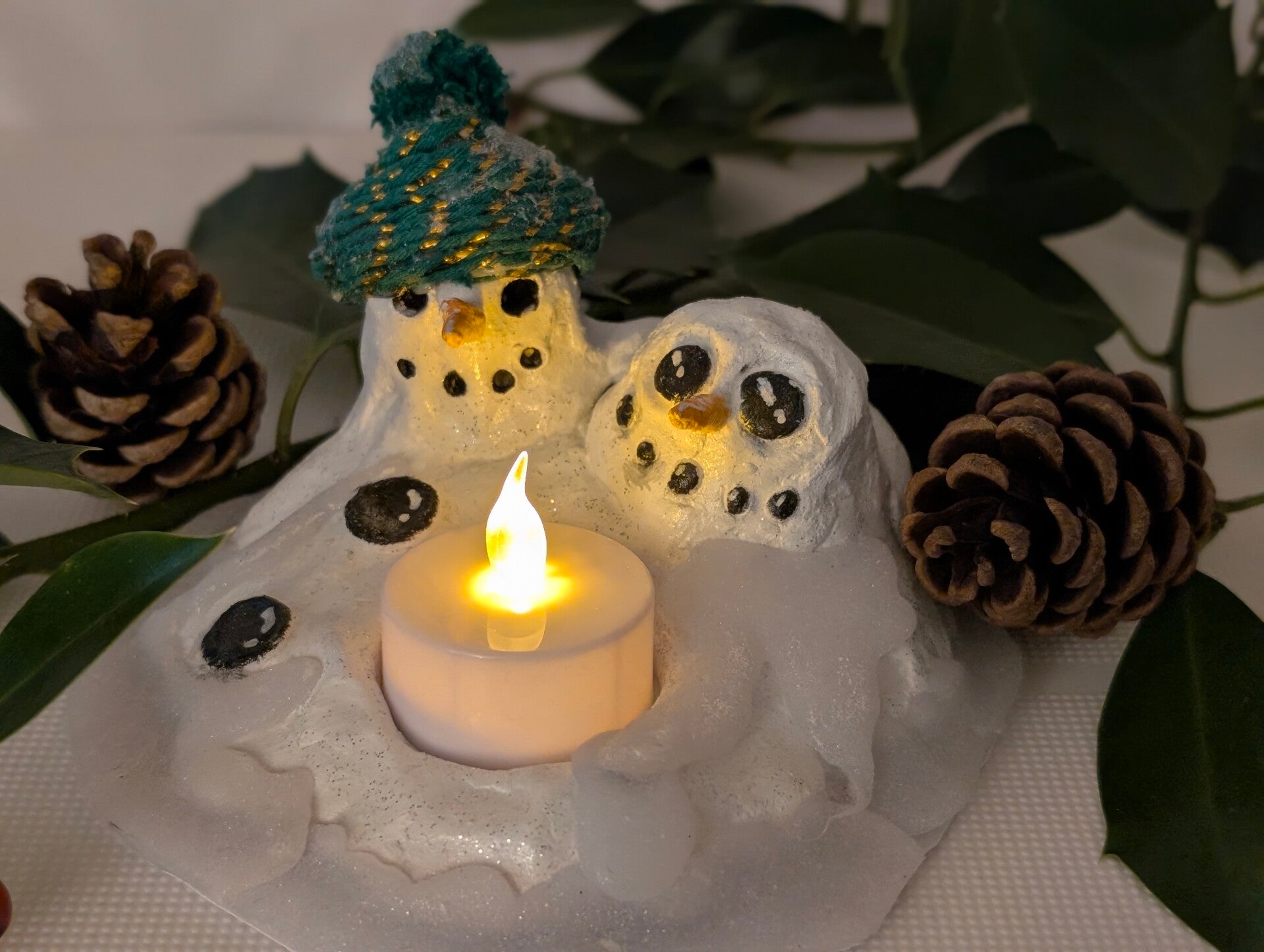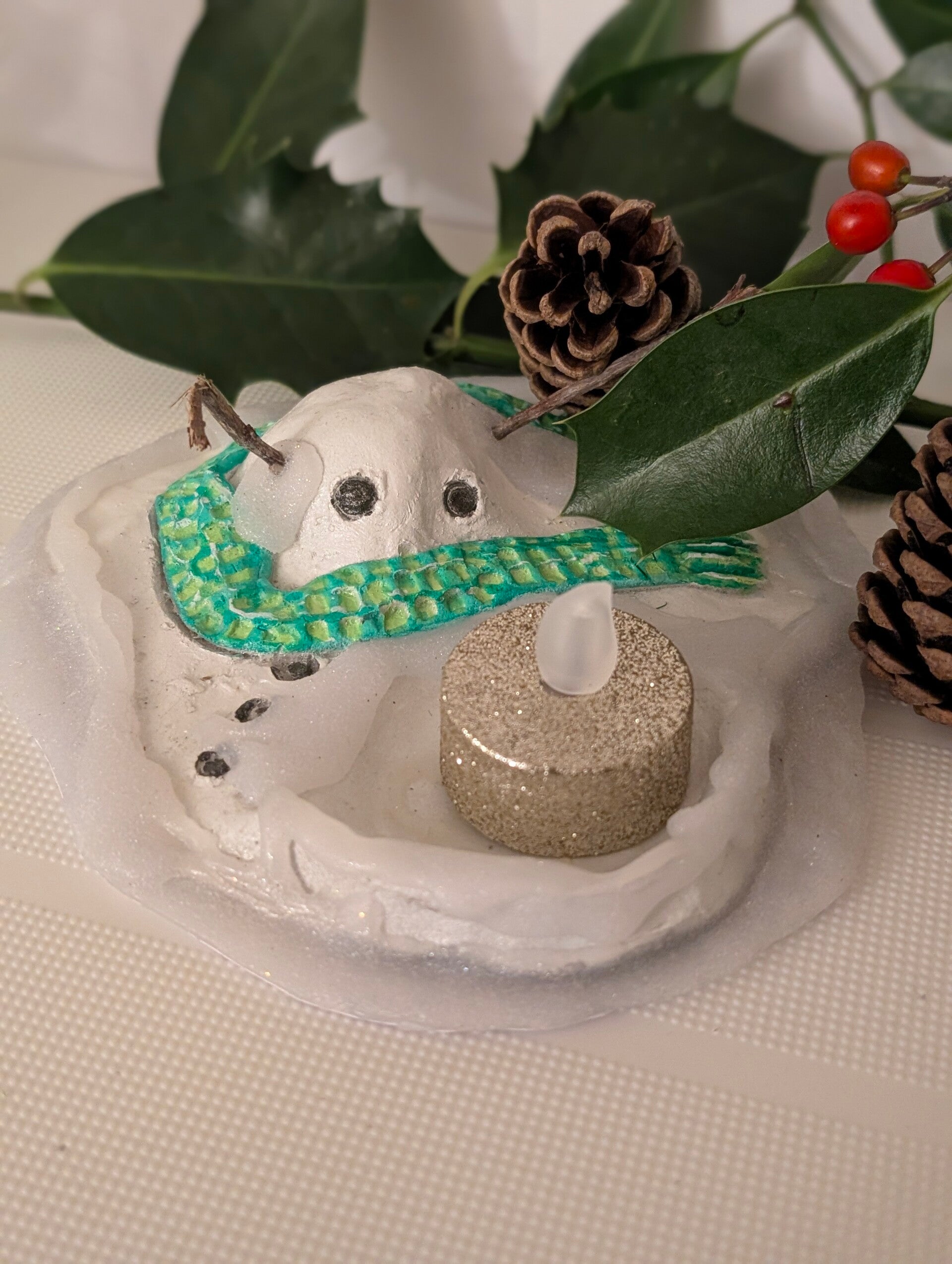 Integrated Tea Light: Designed with a perfect recess to hold a standard battery-operated LED tea light (included/not included - specify), providing a safe, warm, and flickering glow. The melted snowman design may feature a glitter-covered tea light for extra sparkle!