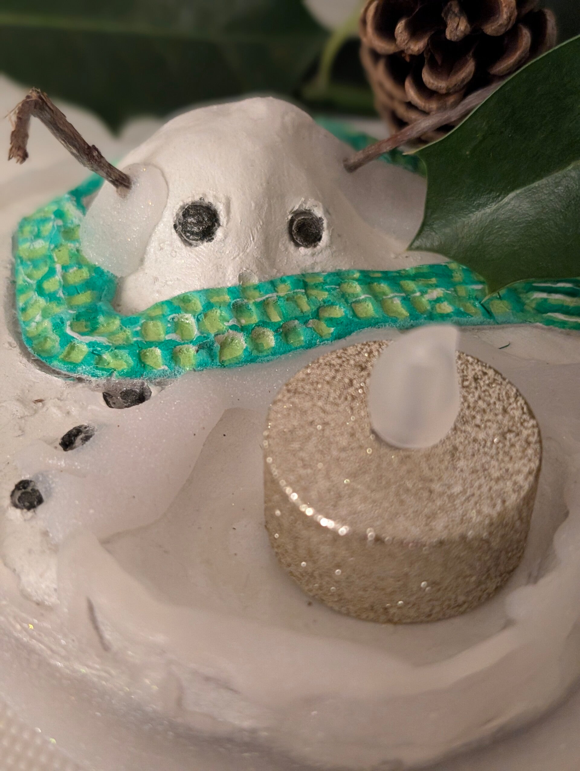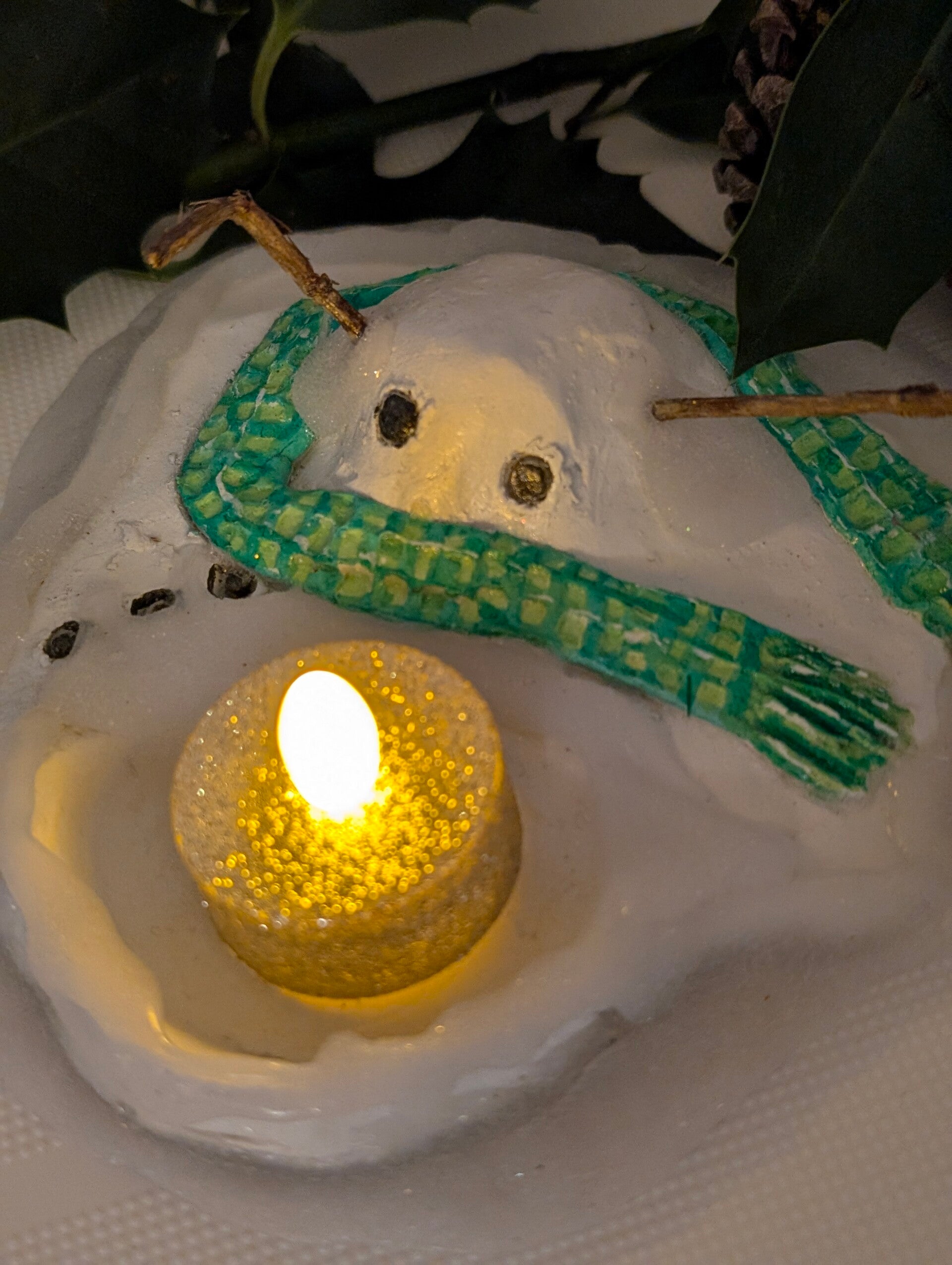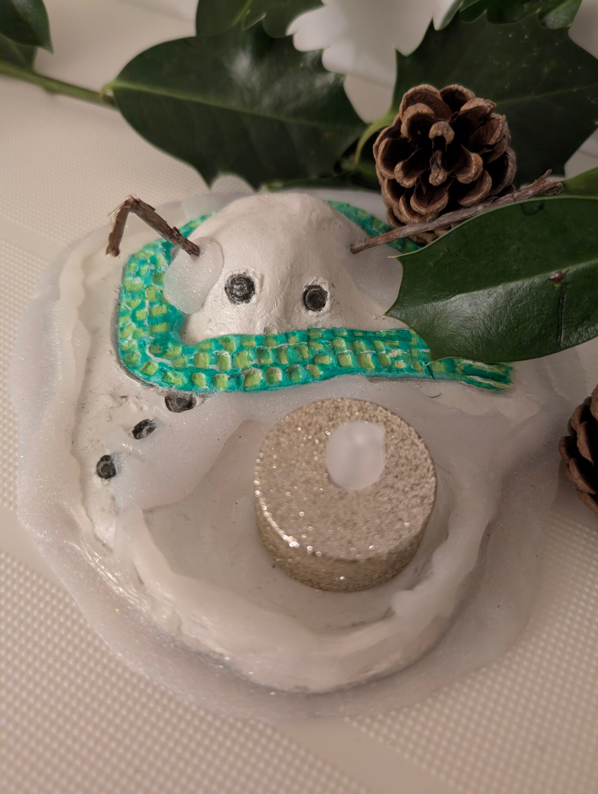 Integrated Tea Light: Designed with a perfect recess to hold a standard battery-operated LED tea light (included/not included - specify), providing a safe, warm, and flickering glow. The melted snowman design may feature a glitter-covered tea light for extra sparkle!