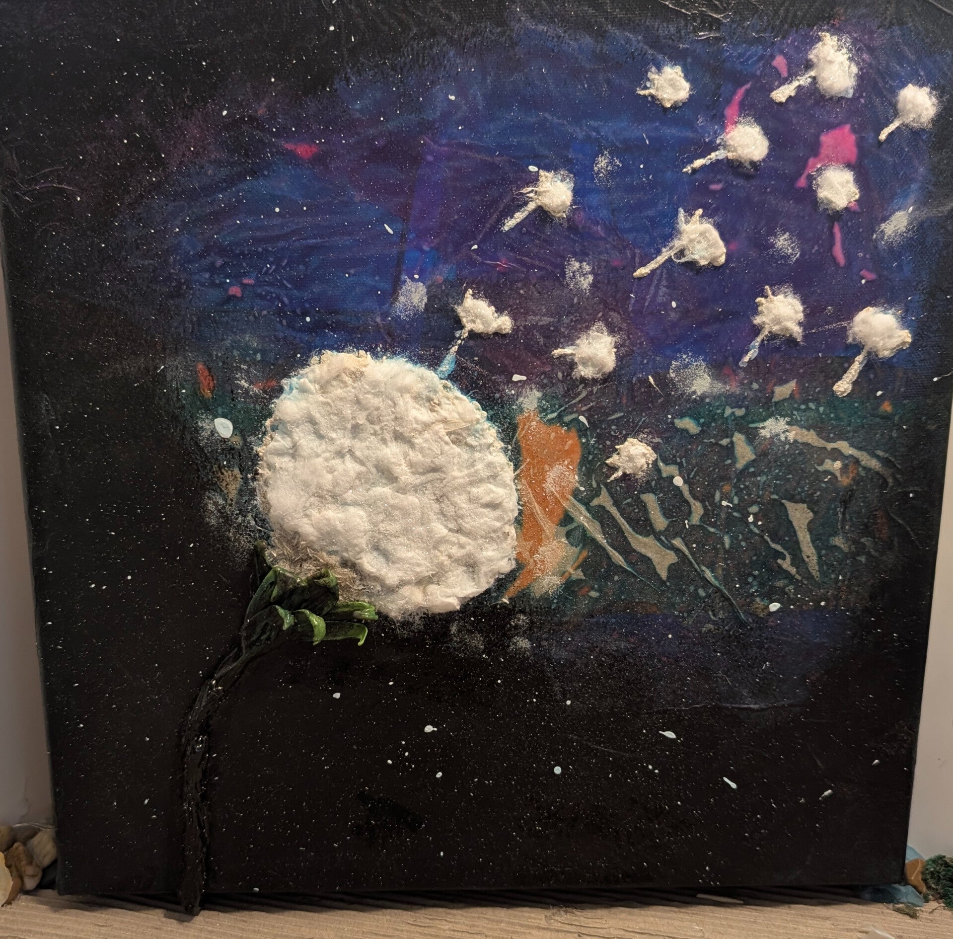 Dimensional Dandelion: A prominent, fluffy white dandelion head bursts forth from the canvas, created with rich texture to give it a tangible, dreamlike quality.