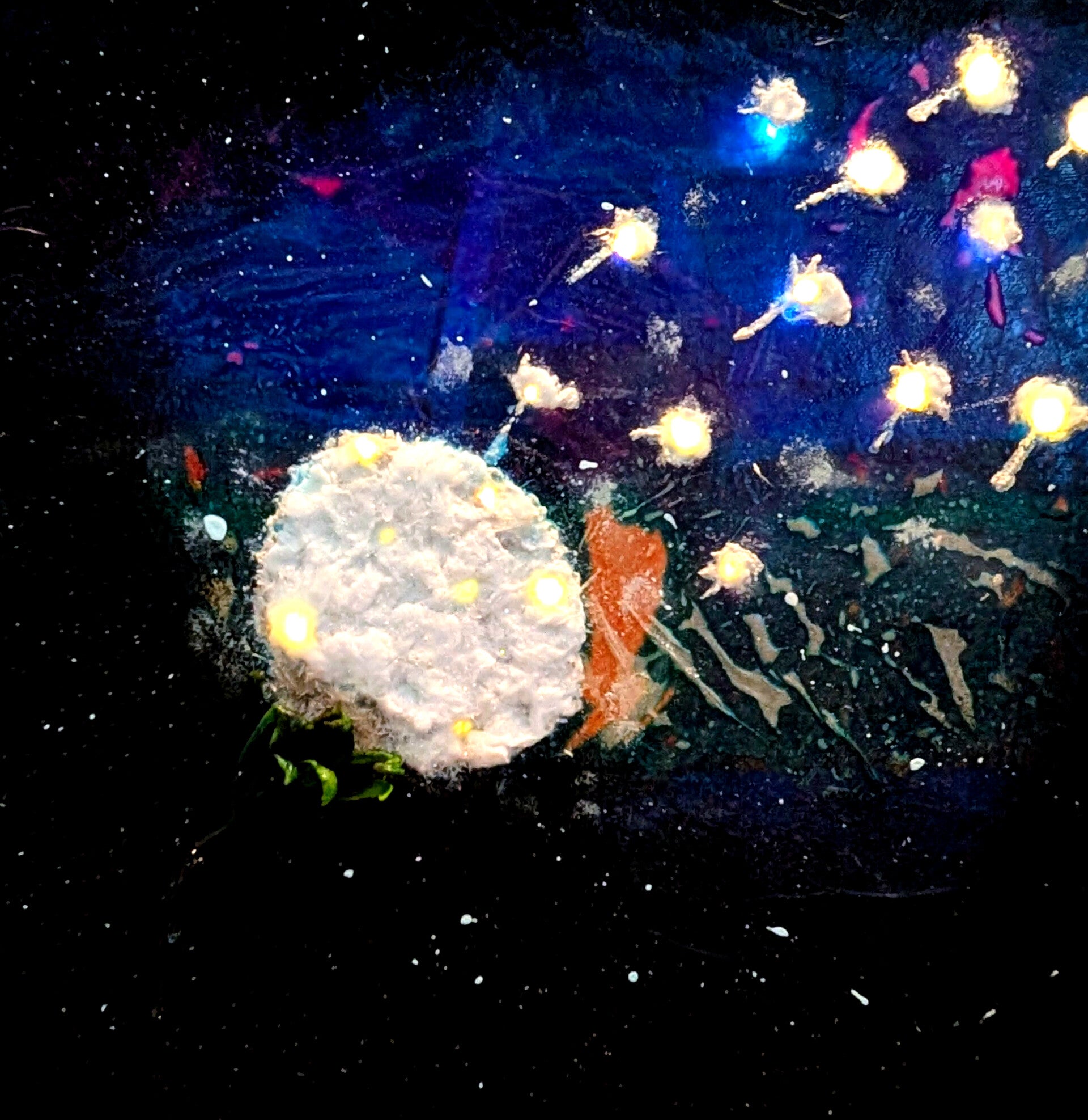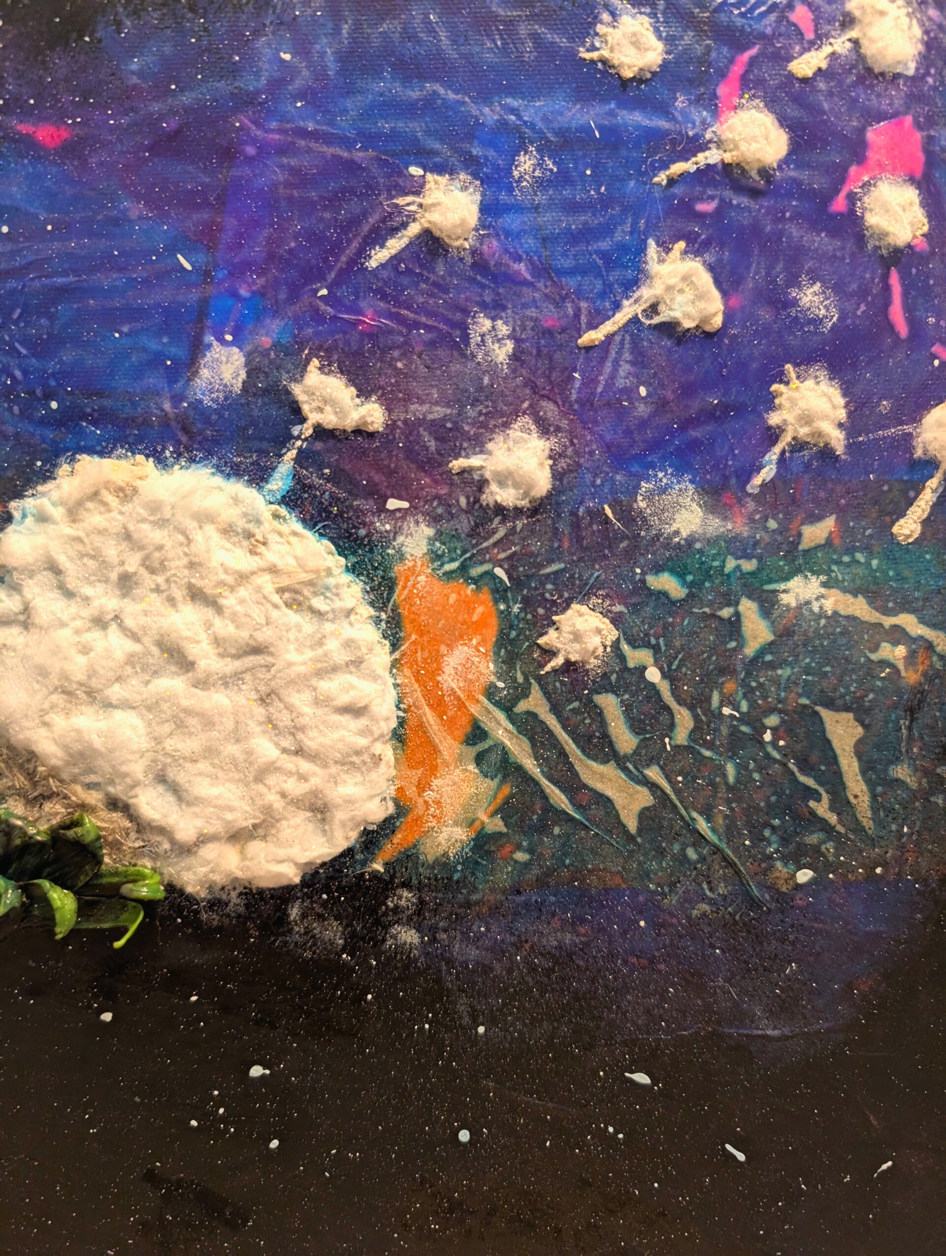 Textured & Mixed Media: The artwork incorporates various textures and materials, from the soft dandelion fluff to the rich impasto-style painting in the background, offering visual and tactile interest.