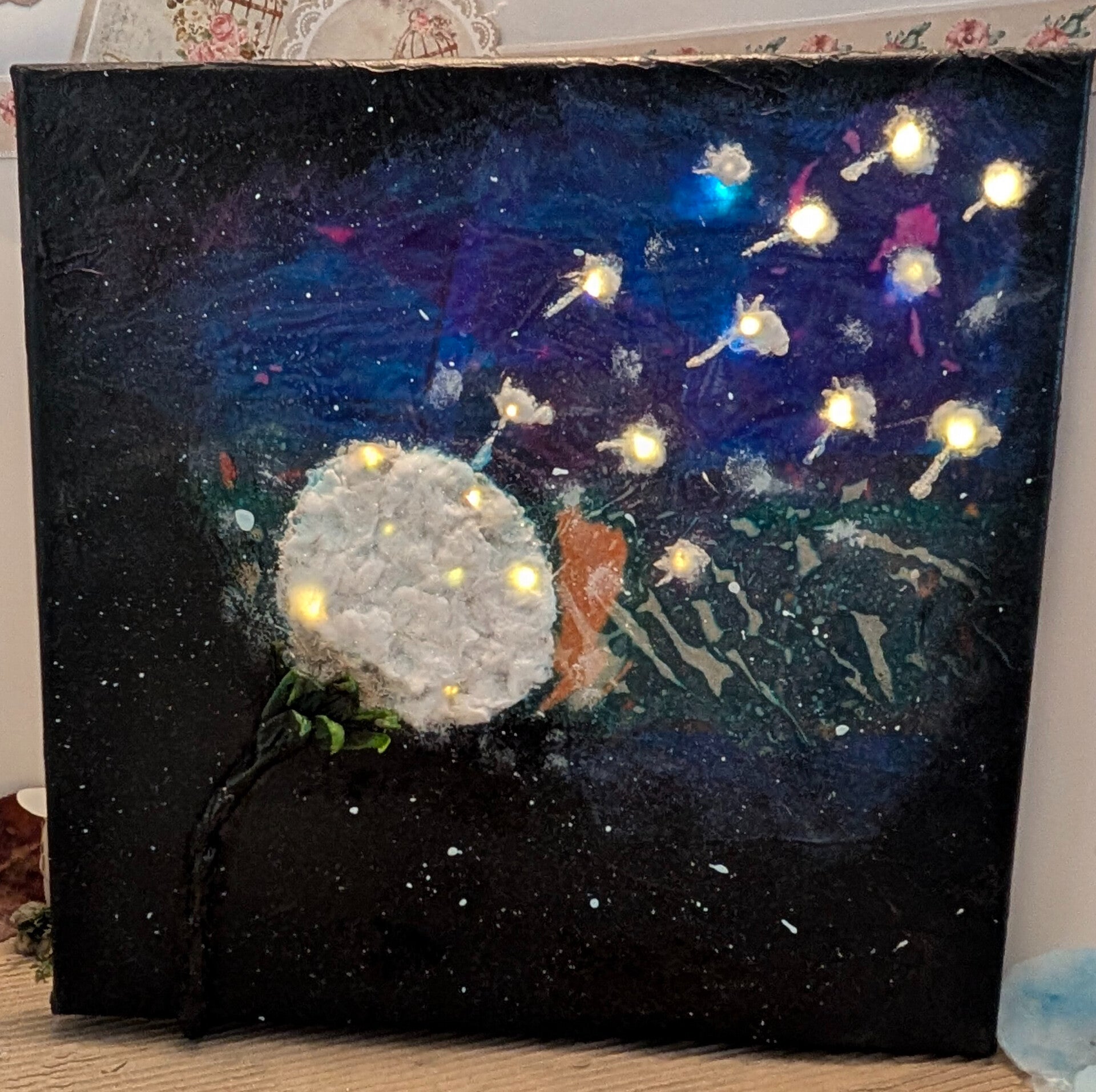 Make a wish and watch it glow with this enchanting, handcrafted light-up canvas art. This unique mixed-media piece beautifully combines texture, vibrant color, and gentle illumination to create a truly captivating display.
